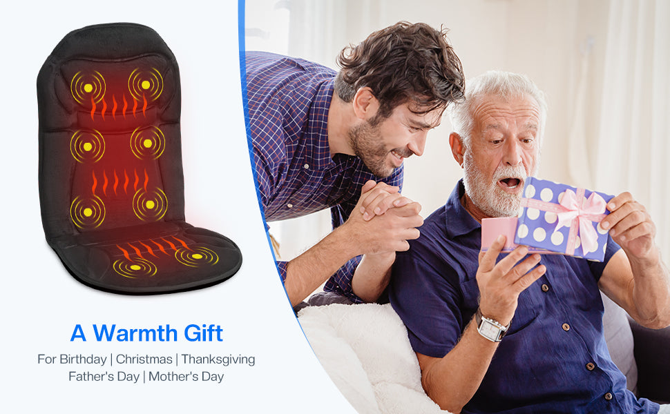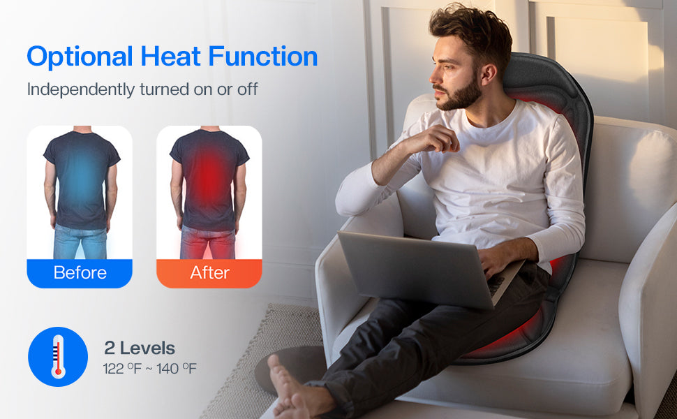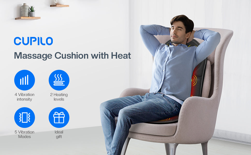 - {Safety & Heating Therapy} Cupilo back massager with heat provides a soothing heat therapy for the back and seat area,delivering a gentle warmth that helps to alleviate tension and enhance blood flow.The seat warmer also features an auto shut off timer and overheating protection system,providing a dual-insurance feature for user safety.With this feature,you can be assured of a secure and comfortable experience while using the device.