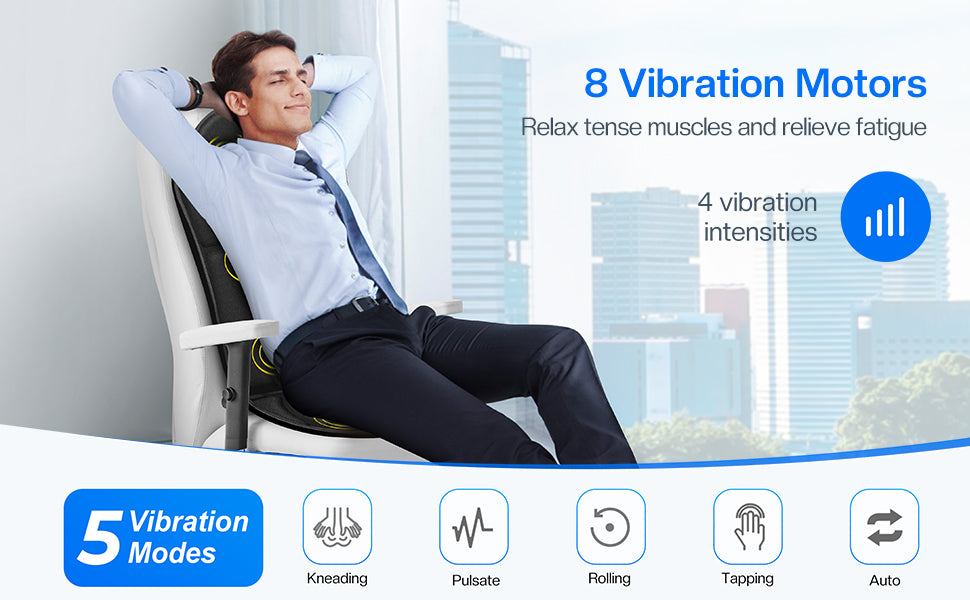 - {5 Vibration Modes and 4 Intensities} Cupilo massage pads for chairs offers a range of options to personalize your massage experience. With 4 different vibration intensities and 5 program modes (including Auto,Tapping,Rolling,Pulsate and Kneading),you can adjust the massage intensity and style to suit your specific needs.